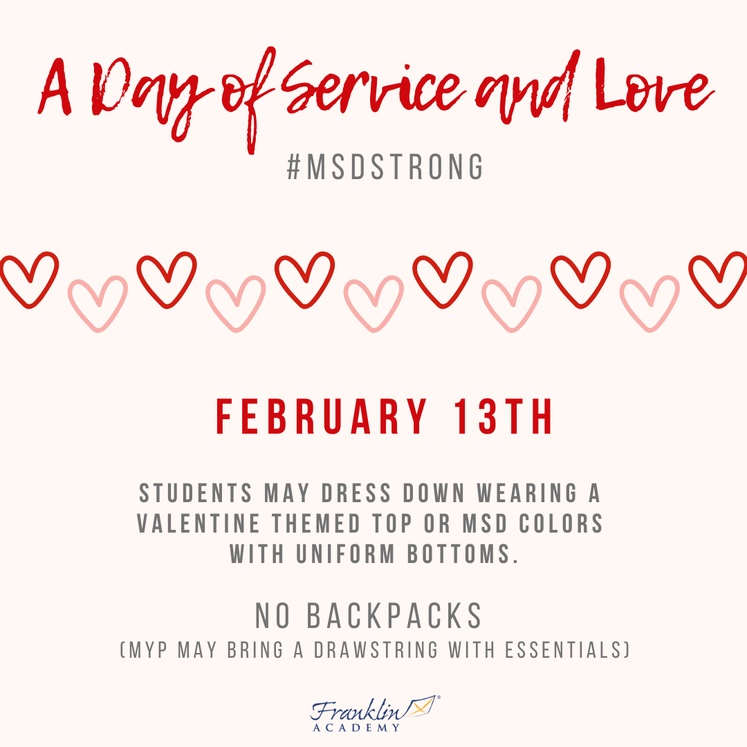 Feb 13 Students May Wear Valentine or MSD Colors (Burgundy, Silver, and White) With Their Uniform Bottoms